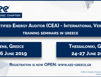 Το Ελληνικό Παράρτημα του Association of Energy Engineers (AEE) ανακοινώνει δύο νέα σεμινάρια Certified Energy Auditor (CEA) – International Version που θα πραγματοποιηθούν στην Αθήνα (3 Ιουνίου – 6 Ιουνίου 2019) και στη Θεσσαλονίκη (24 Ιουνίου – 27 Ιουν