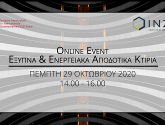 Η GIZ και το INZEB σας προσκαλούν στη διαδικτυακή εκδήλωση που διοργανώνουν την Πέμπτη 29 Οκτωβρίου στις 14.00, η πρόσκληση αφορά όλους εκείνους που ενδιαφέρονται να ενημερωθούν, να συζητήσουν αλλά και να προβληματιστούν όσον αφορά τα "Έξυπνα και Ενεργειακά Αποδοτικά Κτίρια".