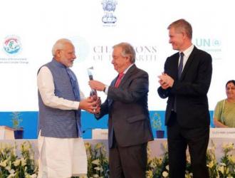 Για την ηγετική του θέση στην καταπολέμηση της πλαστικής ρύπανσης στην Ινδία, και την αδιάκοπη δέσμευσή του για την αντιμετώπιση της κλιματικής αλλαγής σε όλο τον κόσμο, τα Ηνωμένα Έθνη απέδωσαν στις 3 Οκτωβρίου την υψηλότερη περιβαλλοντική διάκριση στον πρωθυπουργό Narendra Modi