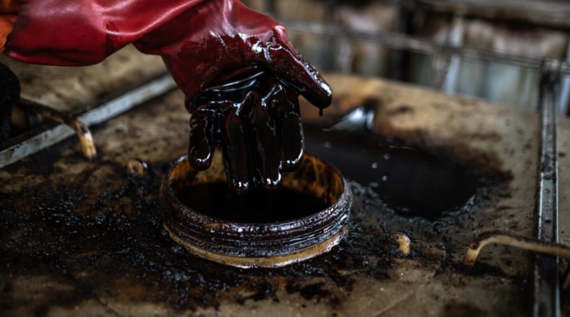 A thick, black liquid bubbles to the surface as Anthony Aalo pokes a stick into the muddy ground just outside Bodo, a fishing and farming community at the heart of Nigeria’s oil-drilling belt.