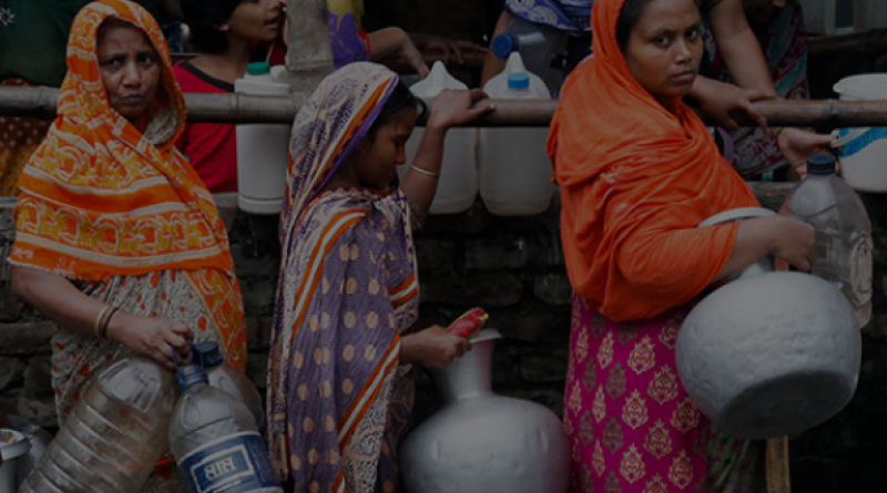Women walking on a flooded footpath in Bogura, Bangladesh. Credit: SOPA Images Limited / Alamy Stock Photo.
