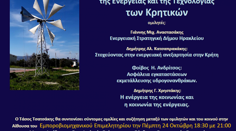 Διοργανώνει εκδήλωση συζήτηση με θέμα "Οι πηγές της Ενέργειας και της τεχνολογίας των Κρητικών."
