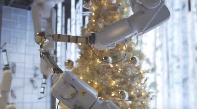 Τέσσερα από το ρομπότ IRB 120 της ABB συνεργάζονται τώρα για να διακοσμήσουν τα κλαδιά ενός χριστουγεννιάτικου δέντρου με 20 εύθραυστα χρυσά στολίδια. Σε μια άλλη βιτρίνα, τέσσερα ABB IRB 1200, αναπαράγουν ήχους από μπρούντζινους αναδευτήρες, ένα ντέφι, ένα μελωδικό κουδούνι και ένα φουτουριστικό ψηφιακό ξυλόφωνο, ενώ οι αγοραστές έξω στο δρόμο μπορούν να επιλέξουν μεταξύ τριών Χριστουγεννιάτικων ρυθμών και να διασκεδάσουν με καραόκε, διαβάζοντας τους στίχους από τρια κινούμενα γραφικά RoboScreens® 38 ιντσών, προσαρτημένα στους βραχίονες των τεσσάρων ρομπότ IRB 120.