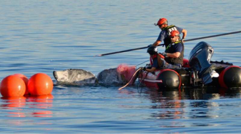 Once a plan is devised, responders attach a buoyed “working line” to help track and slow the whale and then carefully remove the gear using specialized cutting tools designed to minimize additional injury.