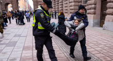 Greta Thunberg is arrested by police officers during a climate protest outside the Swedish parliament in Stockholm, Sweden, in March. Photograph: Michael Campanella/Getty Images