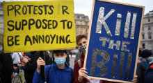 People hold placards as they protest against environmental degradation which they blame on mining activity and climate change, near the Chamber of Mines of the Philippines Convention in Pasay city,…