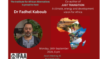 The Institute for African Alternatives is pleased to host Fadhel Kaboub on Monday, 16th September 2024, at 6 pm. Dr Kaboub will give an overview of the report “Just Transition: A Climate, Energy and…