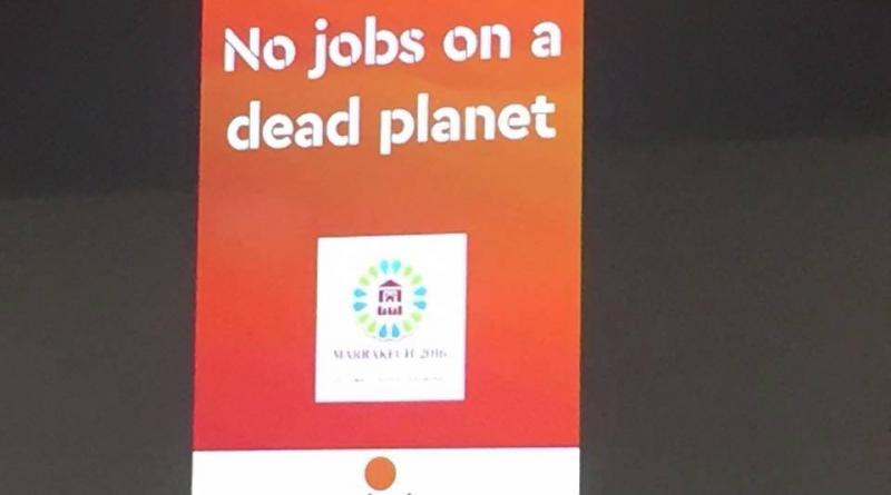 Το σύνθημα είναι από πόστερ της ITUC (διεθνής συνομοσπονδία συνδικαλιστικών οργανώσεων) στο COP22 στο Μαρακες.
