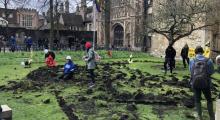 Climate activists have dug up a lawn outside a Cambridge University college over its role in a major development in the Suffolk countryside.