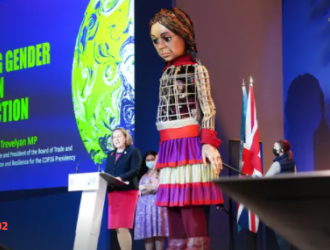 Speaking on stage alongside the puppet 'Little Amal’, leaders and campaigners have said the climate crisis cannot be ended without the empowerment of women. Indigenous women and politicians including Nancy Pelosi, speaker of the US House of Representatives, demanded increased investment.