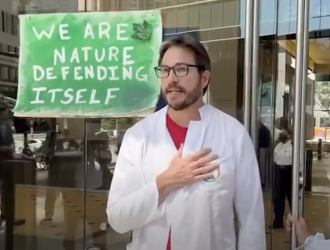 Peter Kalmus was among a group of scientists who chained themselves to a JPMorgan Chase building in Los Angeles in protest of the bank’s financing of fossil fuels.