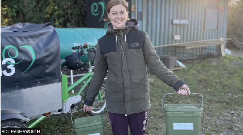 Resident Jenny Liggett helps to deliver food waste to the site from people's homes on her compost electric bicycle.