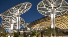 There's more than just cars and empty spaces in this car park. Huge arrays of angled solar panels sit atop jet black steel supports, soaking up the sun and shading the vehicles beneath.