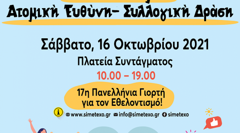 Κίνηση Φορέων Εθελοντισμού 17η Πανελλήνια Γιορτή για τον Εθελοντισμό! Σάββατο, 16 Οκτωβρίου 2021, Πλατεία Συντάγματος, 10.00 – 19.00