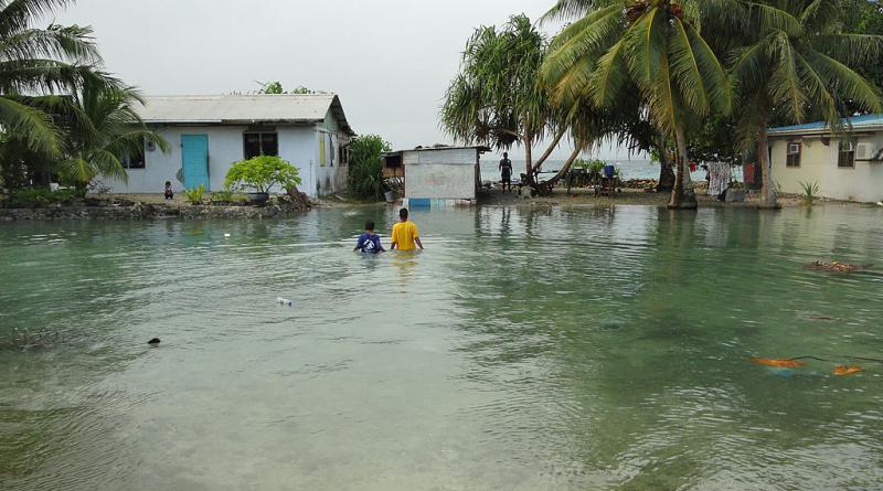 Photo: GIFF JOHNSON/AFP via Getty Images - Local residents wade through flooding caused by high ocean tides in Majuro Atoll, the capital of the Marshall Islands, on February 20, 2011, with a warning of worse to come because of rising sea levels
