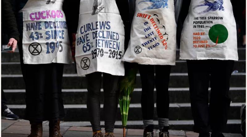 ‘What might be done?’ Extinction Rebellion climate activists wear aprons bearing facts about bird decline during a protest on the sidelines of the Cop26 UN climate summit in Glasgow, November 2021. Photograph: Ben Stansall/AFP/Getty Images