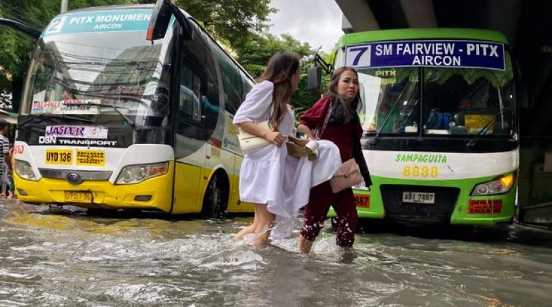 Photograph: Francis R Malasig/EPA - People from the Philippines wade through a flooded street in Manila after Typhoon Saola and Tropical Storm Haikui.