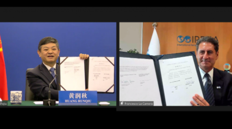Abu Dhabi, United Arab Emirates, 23 June 2021 – The International Renewable Energy Agency (IRENA) and the Ministry of Ecology and Environment of the People’s Republic of China (MEE) have today agreed to extend existing co-operation on energy transition. The joint work will center-stage the acceleration of renewable energy development as central climate solution, enabling China’s pledge to peak emissions before 2030 and achieve carbon neutrality before 2060. The Memorandum of Understanding (MoU) was signed by Francesco La Camera, Director-General of IRENA and Mr. Huang Runqiu, Minister of MEE.