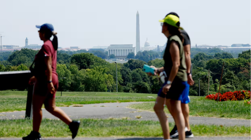 People walk during a heatwave in Arlington, Virginia on 28 August 2024. Photograph: Anna Moneymaker/Getty Images