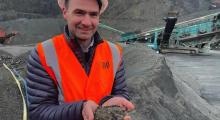 In a quarry surrounded by the din of heavy machinery Jim Mann crouches down and picks up a handful of tiny black rocks.