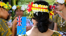 A performer wears the flag of Tuvalu as she waits at a signing ceremony for the Australia-Tuvalu Falepili Union to come into force at the 53rd Pacific Islands Forum Leaders Meeting in Nuku'alofa,…