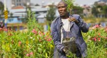 Mekbib Megersa, a survey and construction graduate, engages in gardening and landscaping works that involves mass production of plant seedling across makeshift greenhouse and nursery sites in street-…