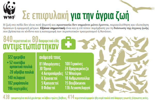 - αντιμετώπιση 840 περιστατικών διάσωσης άγριας ζωής που βρισκόταν σε κίνδυνο, καθώς και και καταγραφή περιστατικών τραυματισμού ή θανάτου.