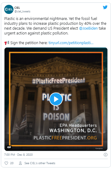 Carroll Muffett, president of the Center for International Environmental Law, another convening partner of the plan, said that "President-elect Biden should commit the United States to actively support a new global treaty on plastic pollution; use U.S. trade power to support real development, not plastic polluters; and move quickly to reverse U.S. subsidies and export policies that are accelerating the plastic crisis globally."