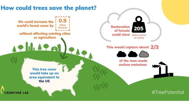 The study shows that the space available for trees is far greater than previously thought, and would reduce CO2 in the atmosphere by 25%.