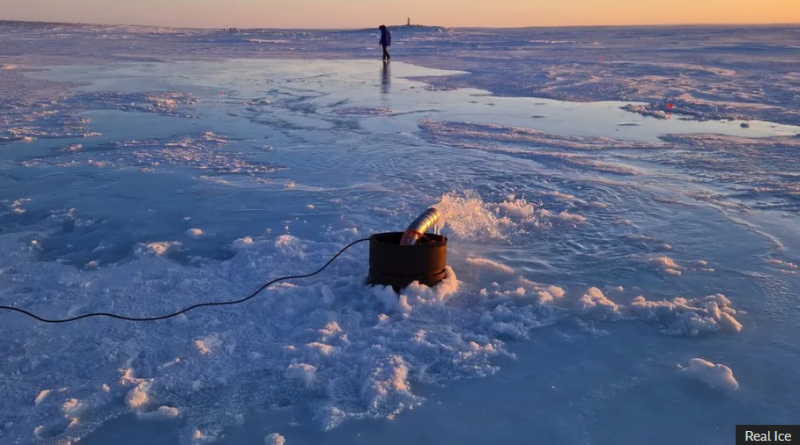 They are drilling a hole in the sea-ice that naturally forms in winter, and pumping around 1,000 litres of seawater per minute across the surface.