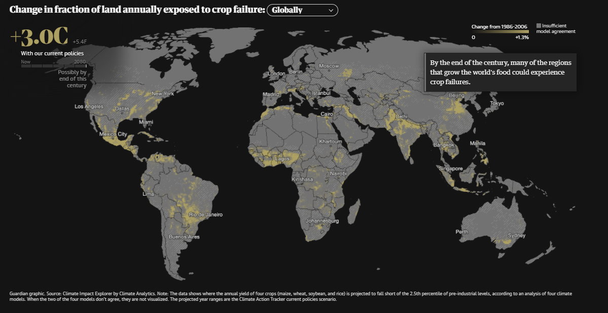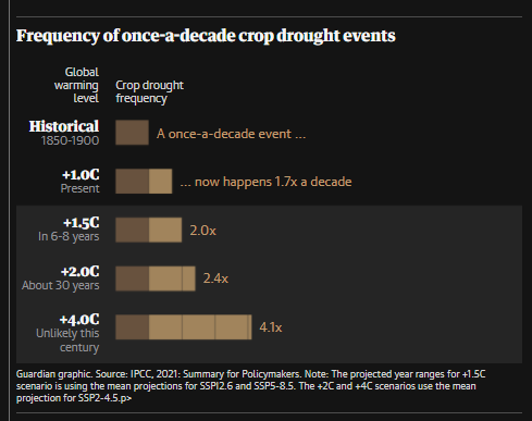 Heat the world a bit more than this and a third of all the world’s food production will be at risk by the end of the century as crops start to wilt and fail in the heat.