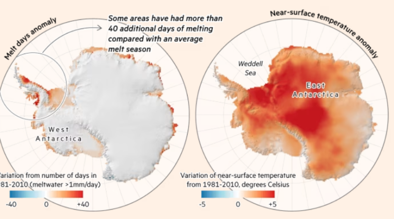 The Antarctic Peninsula in the north-west of continent has been particularly affected, with parts of the region experiencing 40 additional days of melting compared with the long-term average.