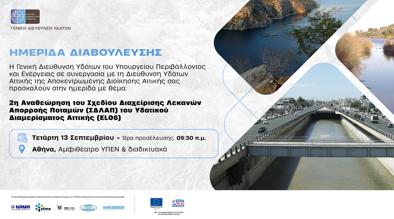 Η Γενική Διεύθυνση Υδάτων του Υπουργείου Περιβάλλοντος και Ενέργειας, σε συνεργασία με τη Διεύθυνση Υδάτων της Αποκεντρωμένης Διοίκησης Αττικής, σας προσκαλούν στην ημερίδα διαβούλευσης της 2ης Αναθεώρησης του Σχεδίου Διαχείρισης Λεκανών Απορροής Ποταμών του Υδατικού Διαμερίσματος Αττικής (EL06). H ημερίδα πραγματοποιείται την Τετάρτη, 13 Σεπτεμβρίου 2023 και ώρα 9:30 π.μ., στο Αμφιθέατρο του Υπουργείου Περιβάλλοντος και Ενέργειας (Λεωφόρος Μεσογείων 119, Αθήνα) με δυνατότητα συμμετοχής και διαδικτυακά και έχει σαν στόχο την πληρέστερη ενημέρωση των ενδιαφερομένων μερών και του ευρύτερου κοινού επί του Προσχεδίου, καθώς και την καταγραφή σχετικών απόψεων και σχολίων.