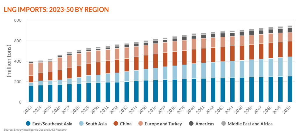 Η παγκόσμια ζήτηση θα καθοδηγείται από την Ασία, αλλά η ζήτηση LNG στην Ευρώπη δεν έχει κορυφωθεί, σύμφωνα με τις προοπτικές. Ειδικότερα, η ΕΕ θα αντιπροσωπεύει το 8% των εισαγωγών το 2050, με τη ζήτηση φυσικού αερίου να βρίσκεται σε ύφεση. Βραχυπρόθεσμα, οι εισαγωγές LNG της ΕΕ αναμένεται να κορυφωθούν και πάλι πριν από το 2030, έχοντας φθάσει σε υψηλό επίπεδο το 2023, μετά τον περιορισμό των εισαγωγών ρωσικού αερίου μέσω αγωγών το 2022.