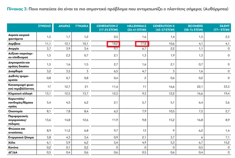Διαφοροποιήσεις υπάρχουν ανά ηλικιακή κατηγόρια, οι οποίες δεν είναι οι αναμενόμενες. Ενώ σχεδόν το 40% των boomers (δηλαδή οι ερωτηθέντες ηλικίας 58-67 ετών) επιλέγουν είτε την κλιματική αλλαγή είτε την καταστροφή του περιβάλλοντος ως το σημαντικότερο πρόβλημα του πλανήτη, μόνο το 24% των μελών της Gen Z (ηλικίες 17-25) και το 20% των Millennials (ηλικίες 26-41) απαντούν το ίδιο. Και για τις δύο κατηγορίες νεότερων Ελλήνων πολύ σημαντικό πρόβλημα για τον πλανήτη αποτελεί η ακρίβεια (18%).