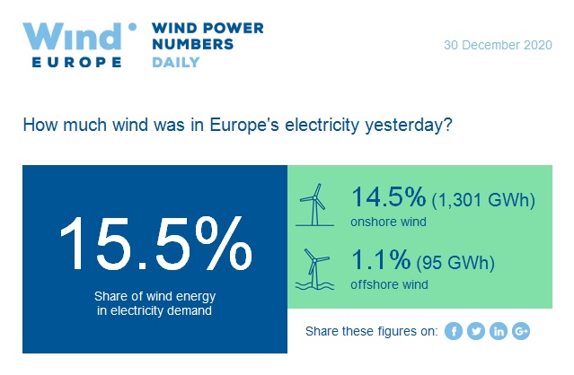 Χθες η συμμετοχή της αιολικής ενέργειας στην ηλεκτροπαραγωγή στην Ελλάδα κατέγραψε ένα εντυπωσιακό 46% που την έβαλε στην πρώτη θέση στην ΕΕ, με 2η την Ισπανία στο 44% και 3η αλλά σε απόσταση την Πορτογαλία.