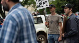 Laura Thompson Osuri, executive director of Homes Not Borders, a refugee care non-profit in the Washington area, stood in the airport check-in area with a sign reading: “Refugee. Noun. A person who has been forced to leave his or her country due to persecution, war or violence. Afrikaners are not refugees.”