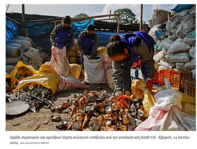 Η ομάδα στρατιωτών και Σέρπα (σ.σ. ορεινός λαός του Νεπάλ και της Πολιτείας Σικίμ της Ινδίας, που έχει αποκτήσει παγκόσμια φήμη ως οδηγοί και αχθοφόροι στα Ιμαλάια) που χρηματοδοτείται από την κυβέρνηση του Νεπάλ, αφαίρεσε 11 τόνους σκουπίδια, τέσσερα πτώματα και έναν σκελετό από το Εβερεστ κατά τη φετινή αναρριχητική περίοδο.