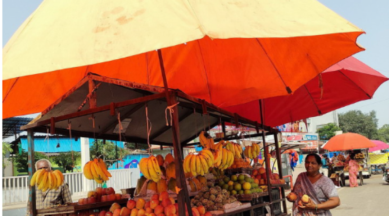 Cover photo: A fruit seller proudly displays the new umbrella she recently installed which provides shade for both herself and her customers. Photo: AIDMI