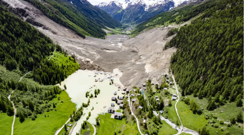 Looking down from the slope above where the village once lay, you can still see the peaks of a few houses, piercing the mud. The valley is a lush sweep of green, pricked with wildflowers that have thrived on Switzerland’s unusually long, warm spring.