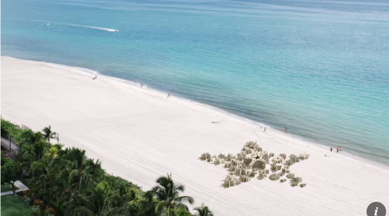 One of the first pieces of this project, Miami Reef Star – a gigantic 90ft star that will eventually be visible to landing aircraft descending over the waters – will be on exhibition during Art Basel Miami Beach. Set up in prototype on Miami Beach itself, it will be a part of Star Compass, a series of three large-scale installations curated by Ximena Caminos and Dodie Kazanjian. In addition to Reef Star, Star Compass will also include The Great Elephant Migration, a work consisting of 100 life-sized sculptures of elephants, and Voile/Toile – Toile/Voile by French conceptual artist Daniel Buren, which will stage an enormous sailboat race.