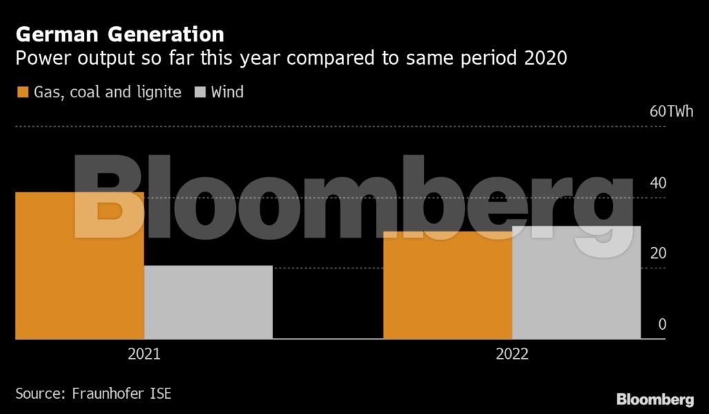 Η Γερμανία έχει εγκαταστήσει 1,5 γιγαβάτ νέας αιολικής ισχύος από το 2020, σύμφωνα με το Fraunhofer ISE. Καθώς αρχίζουν να λειτουργούν περισσότεροι στρόβιλοι, οι περίοδοι καταιγίδων θα βοηθήσουν στην εκτόπιση των μονάδων ορυκτών καυσίμων, οι οποίες έχουν υψηλότερο κόστος παραγωγής. Η εγκατεστημένη αιολική ισχύς στη Γερμανία αναμένεται να αυξηθεί κατά 45% σε 91 γιγαβατώρες έως το τέλος αυτής της δεκαετίας, σύμφωνα με το BloombergNEF.