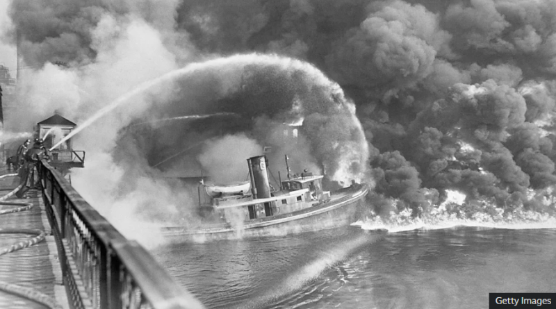 The story reported by Klaric and others was soon picked up nationally. A 1969 Time magazine spread on water pollution reproduced images of the earlier blaze on the river in 1952 – a menacing frontline of flames and black, billowing smoke engulfing a tug boat as it fights to contain a raging fire on the oil-slicked water (the same 1952 image is reproduced at the start of this article). Long, powerful streams of water from firefighters on a nearby bridge cascade over the river, offering backup.