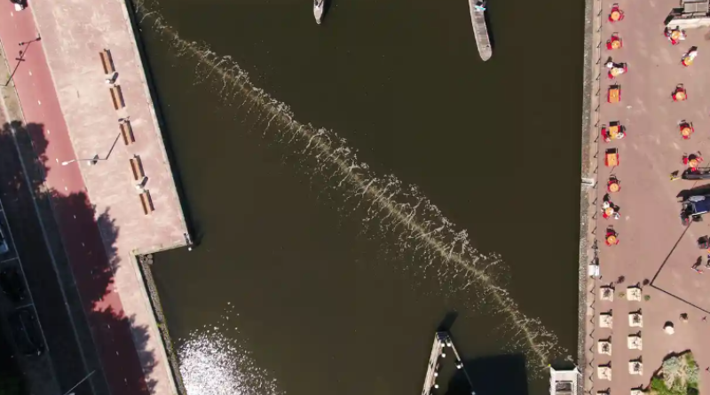 “We place a perforated tube on the bottom of the waterway, at an angle, and then pump through compressed air: the rising air bubbles create an upward current that will lift plastic from the water column to the surface, and then at the surface – together with the flow of the river – it is all pushed to one side,” explains Philip Ehrhorn, the chief technology officer at the Dutch startup The Great Bubble Barrier. “Here, we get the flow from the pumping station, or the wind can also push trash into the catchment system.”
