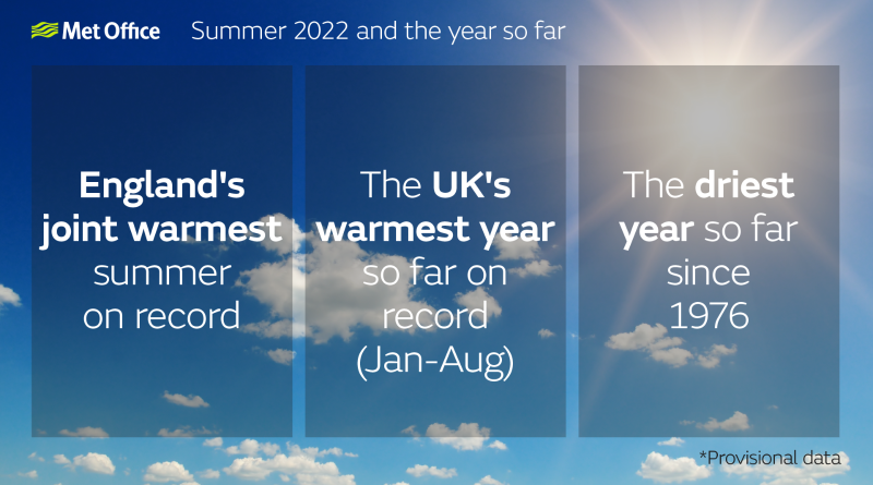 The summer of 2022 will be remembered as a dry and sunny three months, and for England, the joint warmest summer on record according to mean temperature*. This means that four of the five warmest summers on record for England have occurred since 2003, as the effects of human-induced climate change are felt on England’s summer temperatures.
