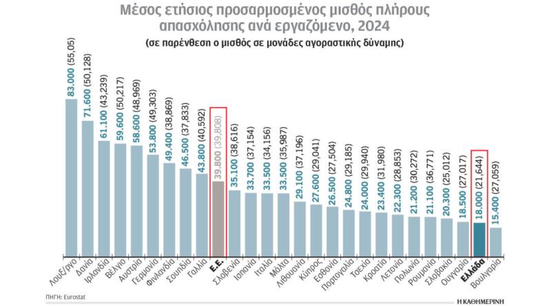 Βάσει στοιχείων της Eurostat, το 2024 η Ελλάδα, ως προς τον μέσο ετήσιο προσαρμοσμένο μισθό πλήρους απασχόλησης (18.000 ευρώ), κατατάσσεται στη δεύτερη χαμηλότερη θέση στην Ε.Ε., με ελάχιστη απόσταση από τη Βουλγαρία (15.400 ευρώ), που βρίσκεται στην τελευταία θέση.