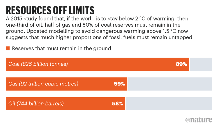 For a 50% chance of remaining below 1.5 °C degrees of global warming — the more aspirational goal of the 2015 Paris agreement — the world must not emit more than 580 gigatonnes of carbon dioxide before 2100, report the authors. Under this scenario, researchers led by environmental and energy economist Dan Welsby at University College London calculate, 89% of coal reserves, 58% of oil reserves and 59% of gas reserves must remain unextracted (see ‘Resources off limits’).