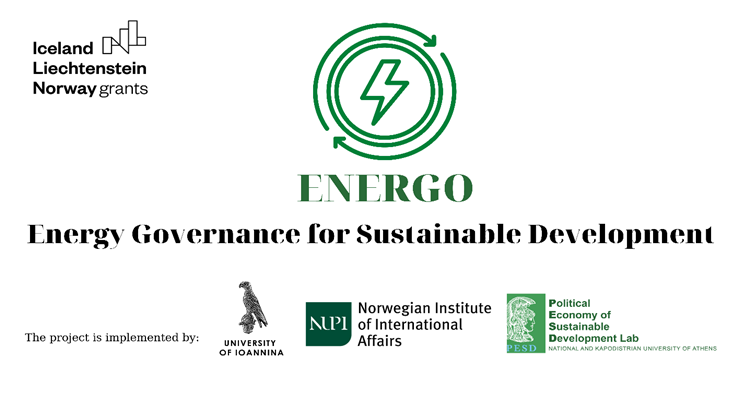 ENERGO is implemented by the Department of Economics at the University of Ioannina in collaboration with the Norwegian Institute of International Affairs and the Political Economy of Sustainable Development Lab at the National and Kapodistrian University of Athens. The project has a duration of 36 months (April 2021-April 2024).