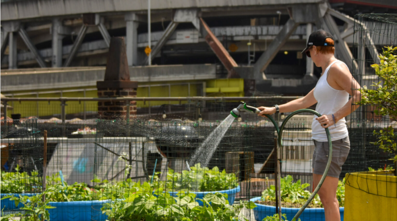 Cover photo: Volunteer Jessica Wilks waters the plants of the Hell’s Kitchen Farm Project with the bridges of the Port Authority in the background. Credit: Ryan Krugman/Inside Climate News