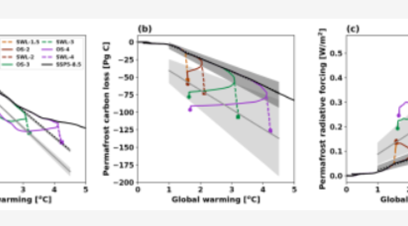 Cover photo: Relationship between global warming levels and three permafrost metrics: (a) permafrost area loss, (b) permafrost carbon loss, and (c) permafrost radiative forcing in the stabilization (colored dashed lines) and overshoot (colored solid lines) scenarios for 1.5 °C (orange), 2.0 °C (brown), 3.0 °C (green), and 4.0 °C (purple) global warming levels, along with the SSP5-8.5 scenario (black). Square and circle markers indicate values in the year 2300 for the stabilization and overshoot scenarios, respectively. All results are based on the PFC simulations. Grey solid lines show linear fits of permafrost metrics to global warming levels in stabilization scenarios by 2300, while black dashed lines show corresponding fits for the SSP5-8.5 scenario. Note that in panel (a), both the stabilization scenarios and the corresponding SSP5-8.5 points included in the linear fit are limited to global warming levels between 1.5 and 3.0 °C, whereas in panels (b) and (c), the fits include points with global warming levels ranging from 1.5 to 4.0 °C. For stabilization scenarios, only the results from the year 2300 are used for fitting, while for the SSP5-8.5 scenario, all results within the specified global warming level ranges are used for fitting. Shaded regions represent the 5th to 95th percentile ranges across 250 ensemble simulations.